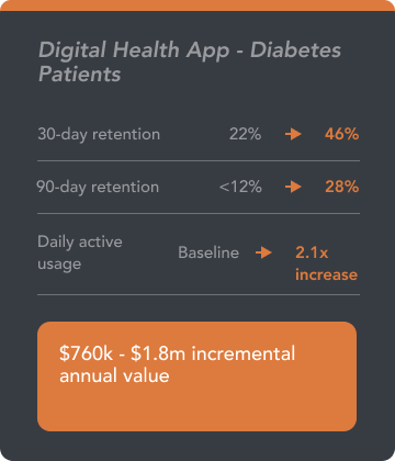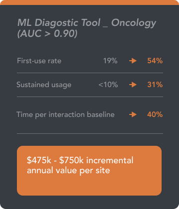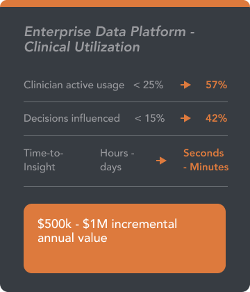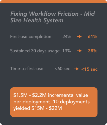 Get access to documented interventions with full before/after metrics: workflow friction repair, EHR integration recovery, app drop-off reversal, and data platform clinical activation.
