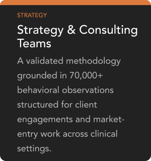 Our foundation is thousands of structured investigative interviews, reconstructing real clinical decision-making environments step by step, not asking stakeholders to describe how they think they behave. The output is a behavioral map of the conditions under which adoption succeeds or fails. We then translate that map into concrete action.
